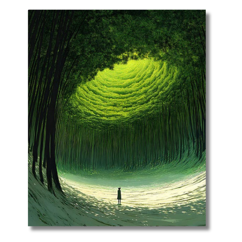 Unveil the mesmerizing beauty of "Threshold of Awe." This kit is your passport to an electric green sanctuary, where a solitary figure stands at the edge of the sublime. Experience the deep satisfaction of creating this spiraling forest masterpiece, transforming vibrant light and shadow into your personal expression of wonder. Your masterpiece awaits.